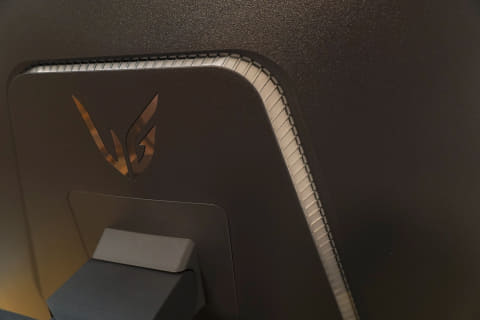 ブラックを主体としたデザインは正面から見ると、スタンド台にプリントされた「Ultra Gear」のロゴ以外は画面の表示を邪魔しない控えめのデザインになっている。背面のロゴマークも控えめで、置き場所を選ばない高いデザイン性を感じる。