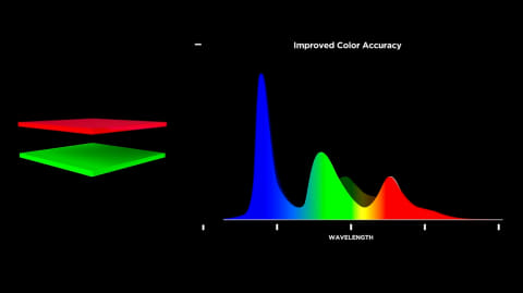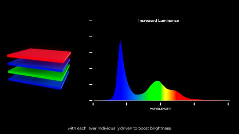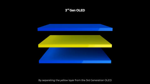 しかし、黄色を使っているために青に比べて緑と赤のピークが低くなるという弱点があった。「プライマリーRGBタンデム テクノロジー」は、従来の有機ELの弱点であった輝度と寿命、そして色の純度を劇的に改善する画期的な技術として開発された。