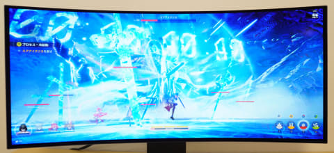21:9のシネマスコープサイズで表示できるので、通常のモニターでは上下に黒い帯が入って画面が小さくなるようなカットシーンでも、大迫力をそのままのサイズで楽しめる。広い視野角によって、目の前に実際に風景が広がっているような没入感を感じることができる。本製品は39インチとの表記だが、32インチのモニターが横長になったと言うとイメージしやすいかと思う。