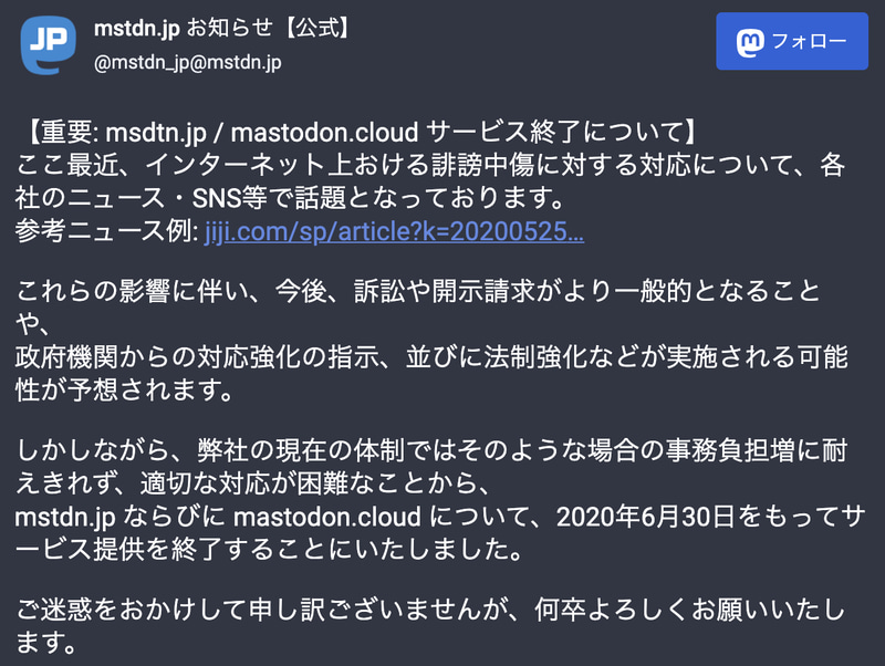 「マストドン」、「mstdn.jp」および「mastodon.cloud」が6月30日にサービス終了へ