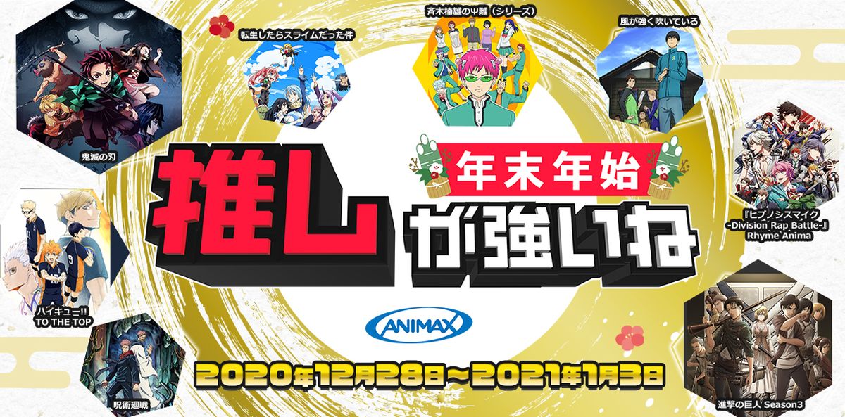 ©吾峠呼世晴/集英社・アニプレックス・ufotable©諫山創・講談社/「進撃の巨人」製作委員会©麻生周一/集英社・PK 学園 ©麻生周一/集英社・PK 学園 2©古舘春一/集英社・「ハイキュー!!」製作委員会・MBS©三浦しをん・新潮社/寛政大学陸上競技部後援会©川上泰樹・伏瀬・講談社/転スラ製作委員会©芥見下々/集英社・呪術廻戦製作委員会