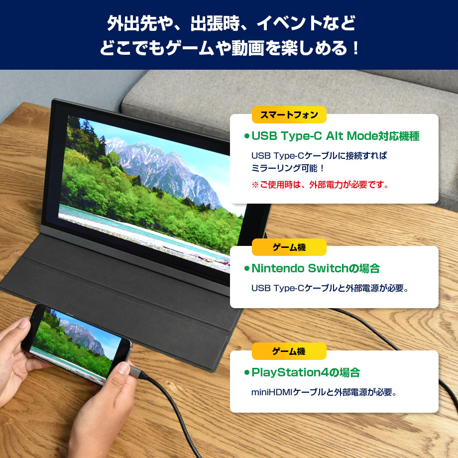 ※USB-Cケーブルにて映像を出力する場合は、デバイス側がalt modeに対応しているか予めご確認ください。※本製品及び、各デバイスに外部電源を接続してからの使用を推奨いたします。※VESA取付用のネジは付属しておりません。