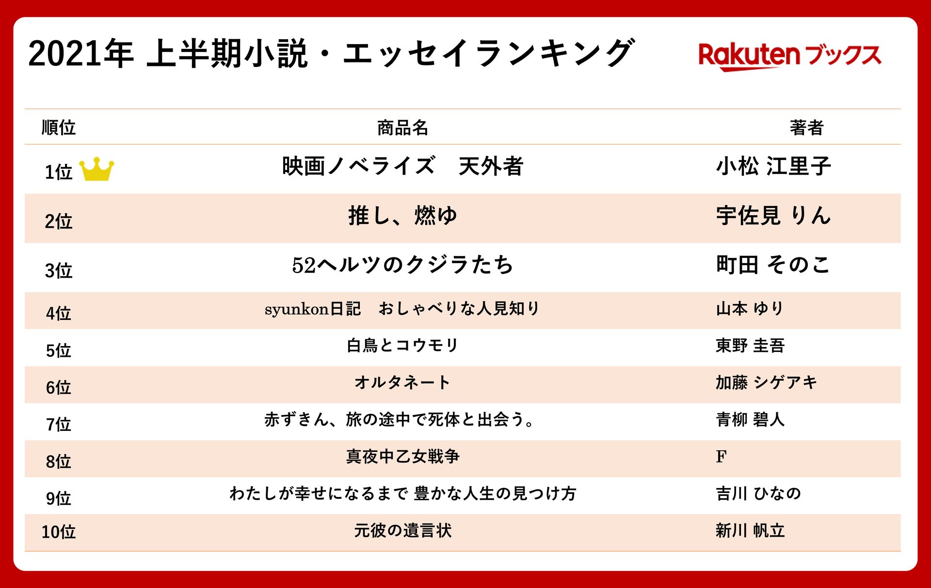 楽天、楽天ブックスやRakuten Musicなどの「2021年 エンタメ上半期ランキング」を発表(3/6)