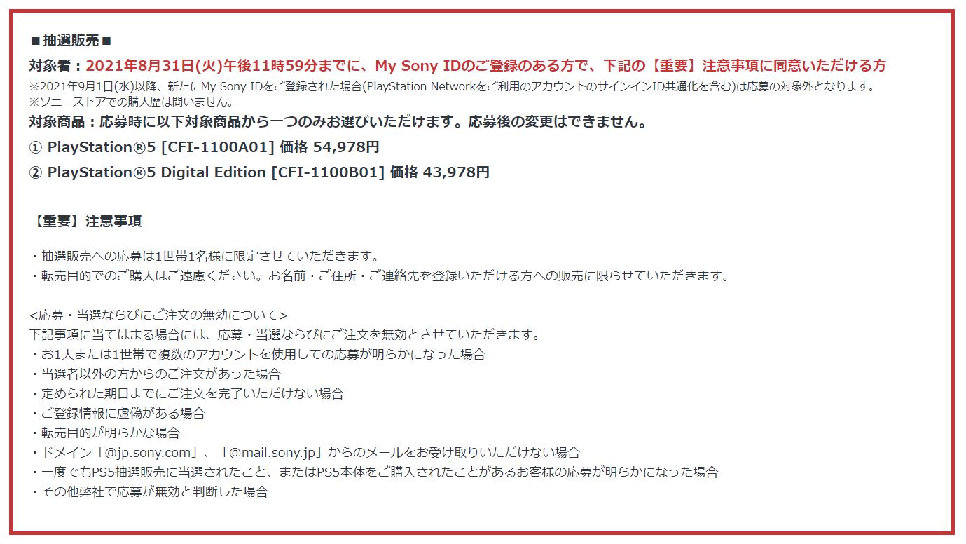 ソニーストア、実施中のPS5抽選受付は本日11時締め切り(2/2)