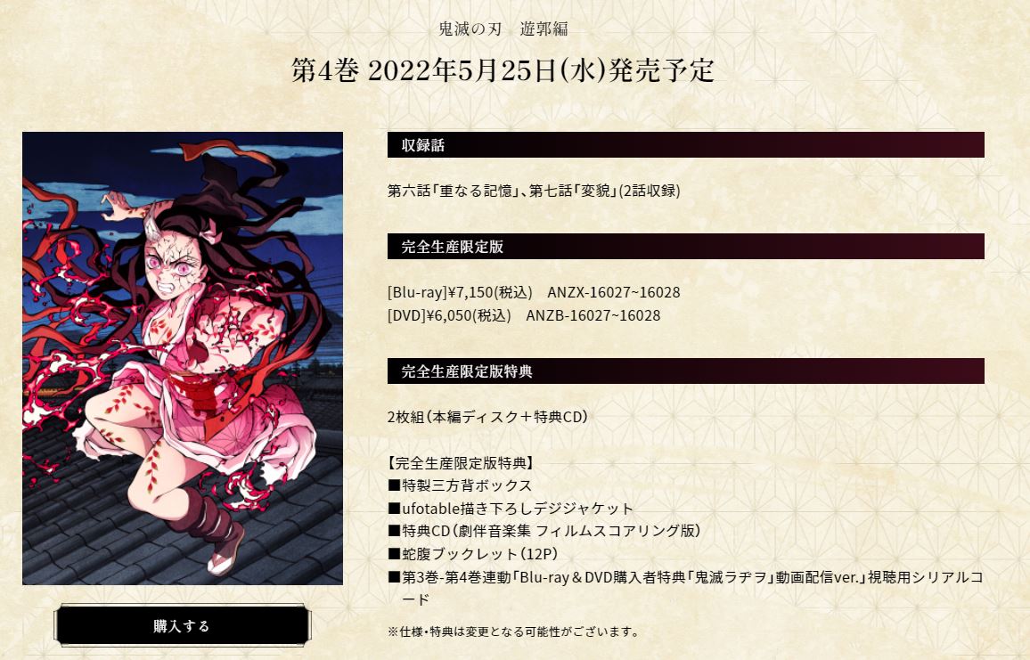 ©吾峠呼世晴/集英社・アニプレックス・ufotable Amazon/楽天で購入鬼滅の刃 遊郭編 4【完全生産限定版】 [Blu-ray]Amazonで購入楽天で購入鬼滅の刃 遊郭編 4【完全生産限定版】 [DVD]Amazonで購入楽天で購入