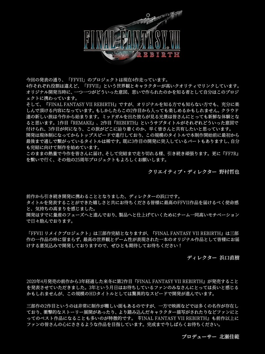 クラウド達の新しい旅は今作から始まる。「ファイナルファンタジーVII REBIRTH」野村哲也氏らのコメントが公開(2/2)