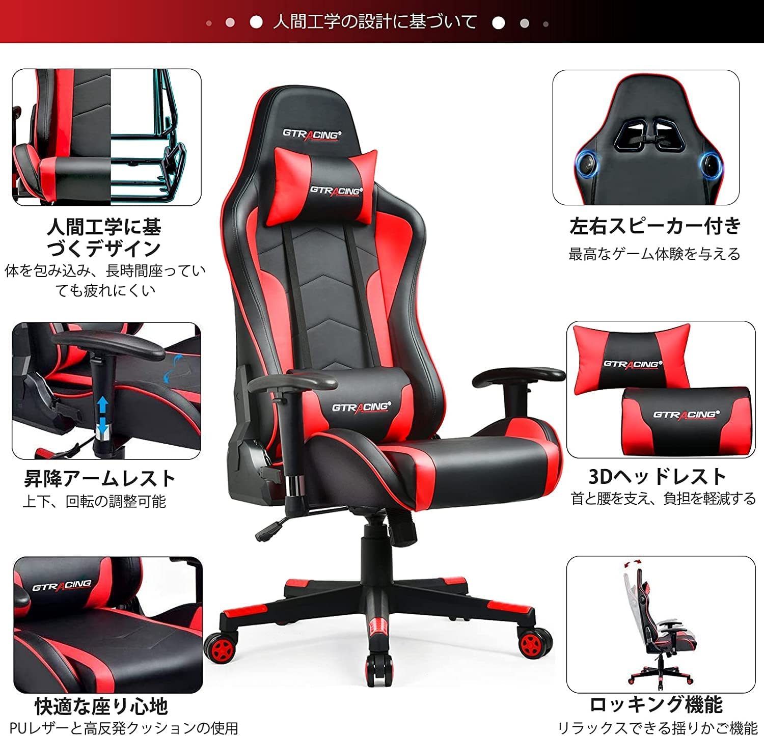 • Gtracing ゲーミングチェア メッシュ 多機能 通気性 ゲーム用チェア オフィスチェア パソコンチェアリクライニング 事務椅子 ヘッドレスト ランバーサポート ひじ掛け付き GTBEE-RED