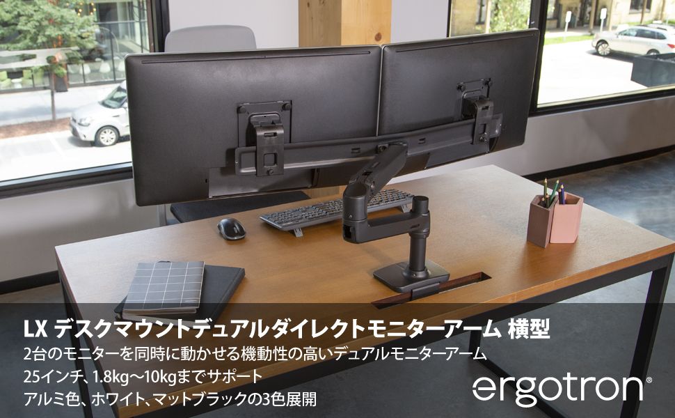 • エルゴトロン LX デスクマウント デュアル ダイレクト モニターアーム 横型 アルミニウム 25インチ(1.8~10.0kg)まで対応 45-489-026