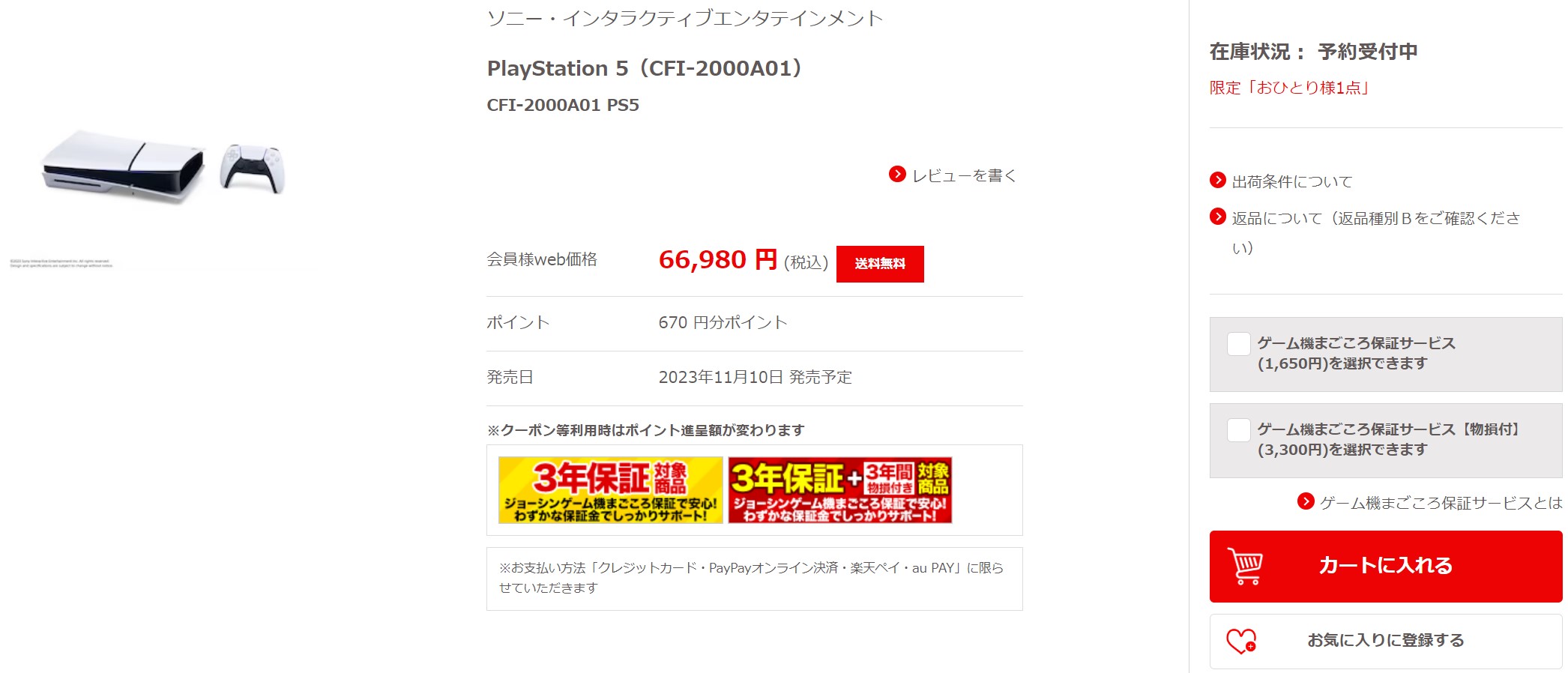 ジョーシンWebにて新型PS5の予約受付が開始!(2/5)