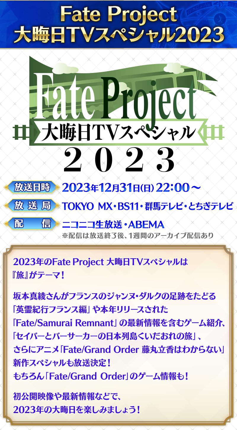 「Fate Project 大晦日TVスペシャル2023」放送決定! 今年は「旅」がテーマ
