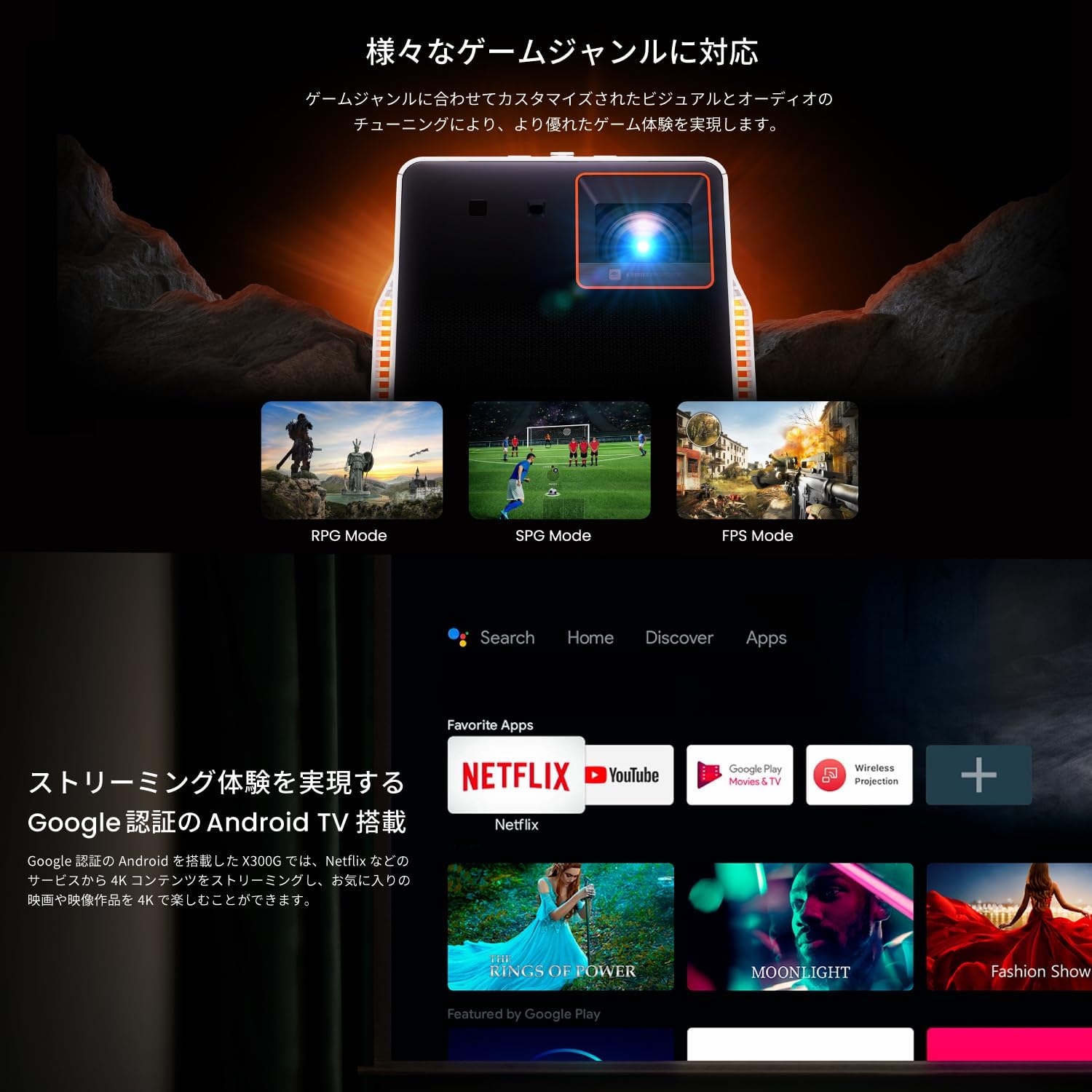 • BenQ X300G ポータブルゲーミングプロジェクター X Series/2000ANSIルーメン/4K解像度/低遅延/短焦点/オートフォーカス/縦横回転台形補正/電動ズーム/LED光源/フルHD 240Hz対応/Netflix対応Android TV搭載