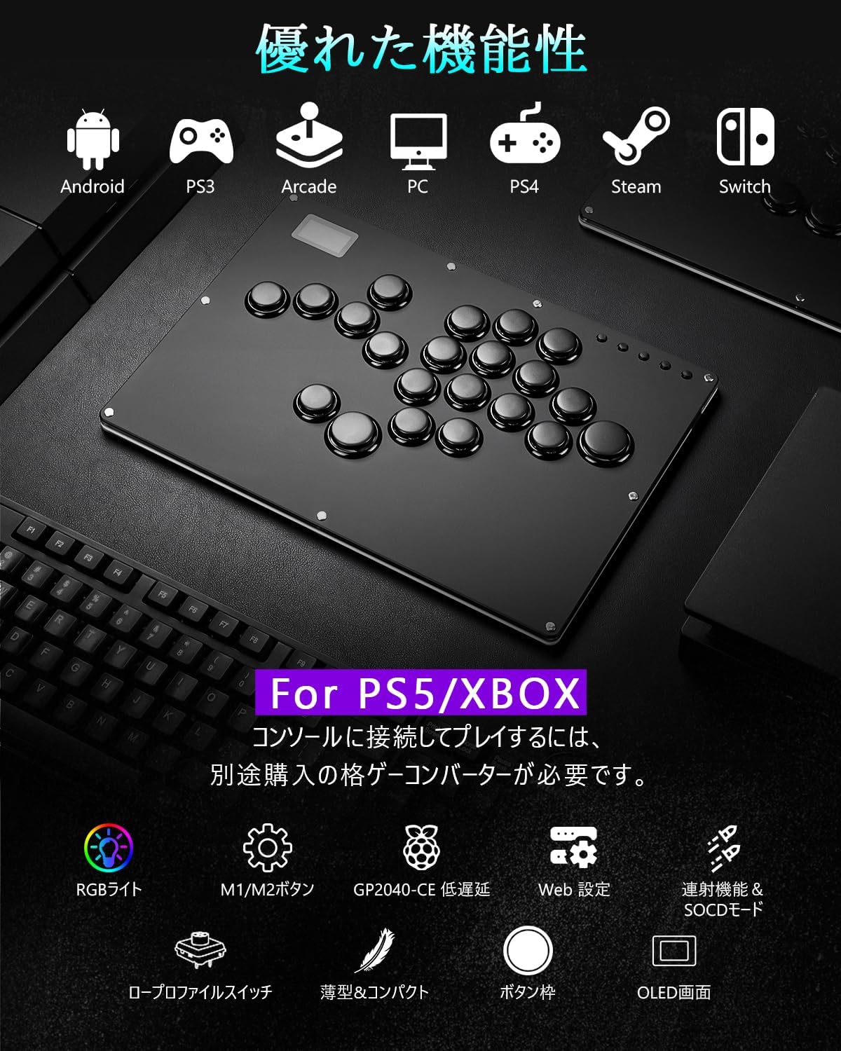 • レバーレス アケコン レバーレス アーケードコントローラー 16ボタン for PC/Switch/PS4/PS3/Steam 薄型 軽量 ホットスワップ対応 RGBライトDIY 連射機能 日本語説明書付き
