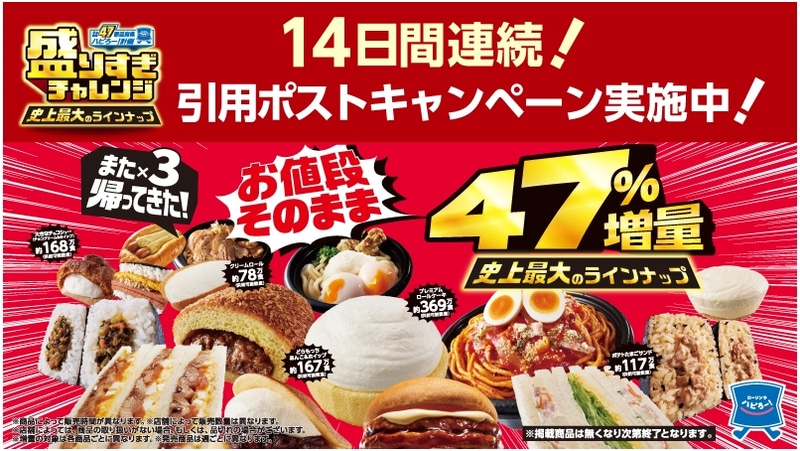ローソン、「盛りすぎチャレンジ」キャンペーンを6月3日(ローソンの日)より開催。50%増量商品が過去最大41品登場