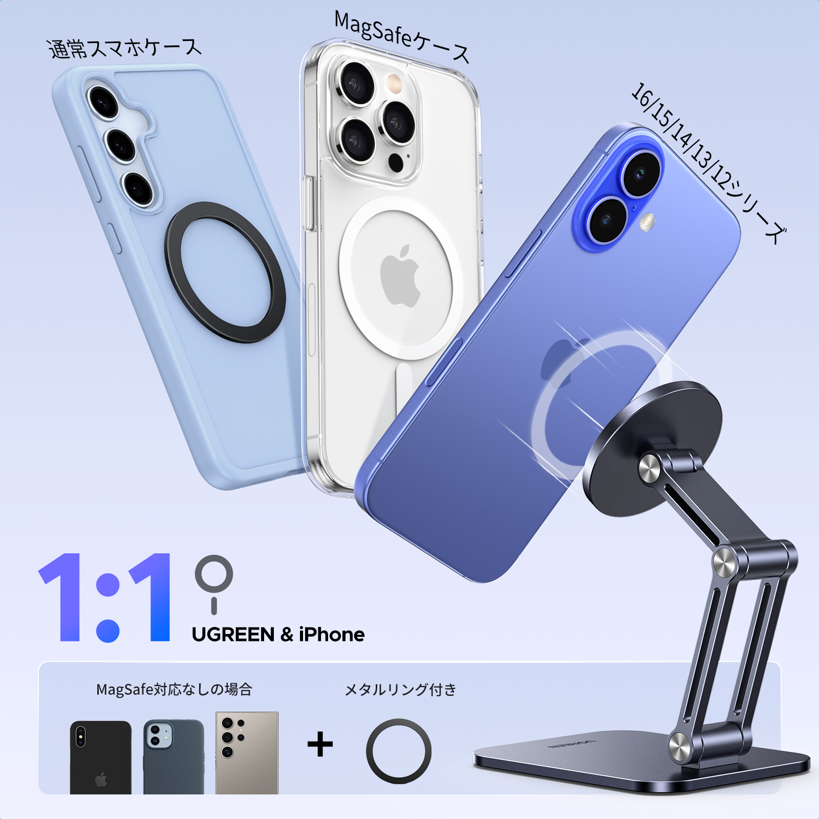 • UGREEN スマホスタンド MagSafe対応 卓上用 マグネットスタンド 折り畳める iPhone16 15 14 13 12シリーズ対応 MagSafeケース対応 三関節調整 アルミニウム合金製 マグセーフスタンド