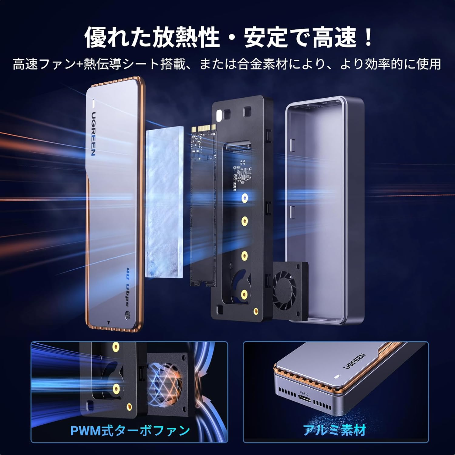 • UGREEN M.2 SSD 外付けケース 【USB4 40Gbps】 M.2 SSD ケース NVME/Pcie ケース Thunderbolt 3/4 PCIe 4.0x4対応 アルミ制 m.2 ハードディスクケース NVME SSDに対応 2本ケーブル付属