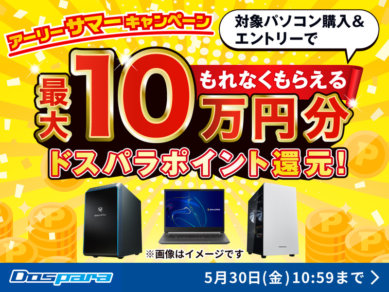 ドスパラ「夏のボーナス先取りキャンペーン」開催! 対象PC購入&エントリーでドスパラポイント最大10万円分もれなく還元