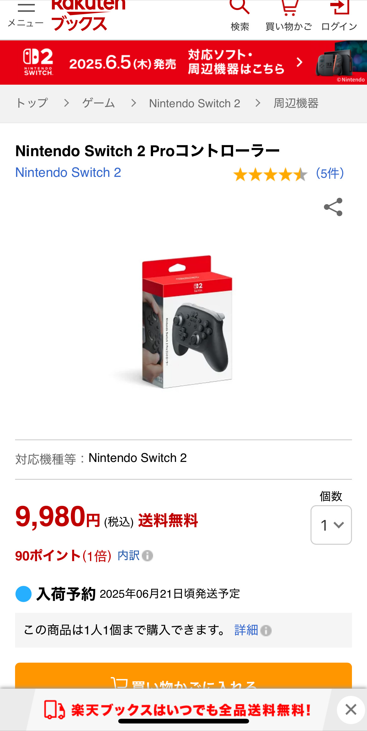 楽天ブックス、Switch2の抽選受付を開始。期間は6月19日11時59分まで
