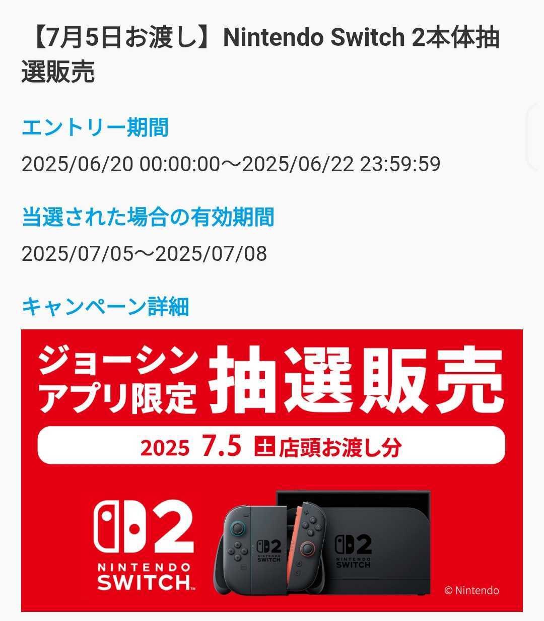 「Switch 2」抽選! 「ジョーシンアプリ」6月22日まで受付中(6/8)