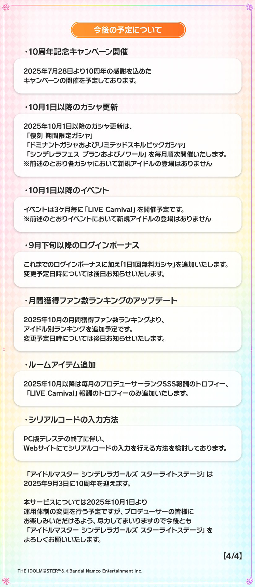 「デレステ」2025年10月以降サービスの開発・運用体制変更を発表。変更に伴いPC版のサービス終了、有償スタージュエルの販売内容変更など公開(4/5)