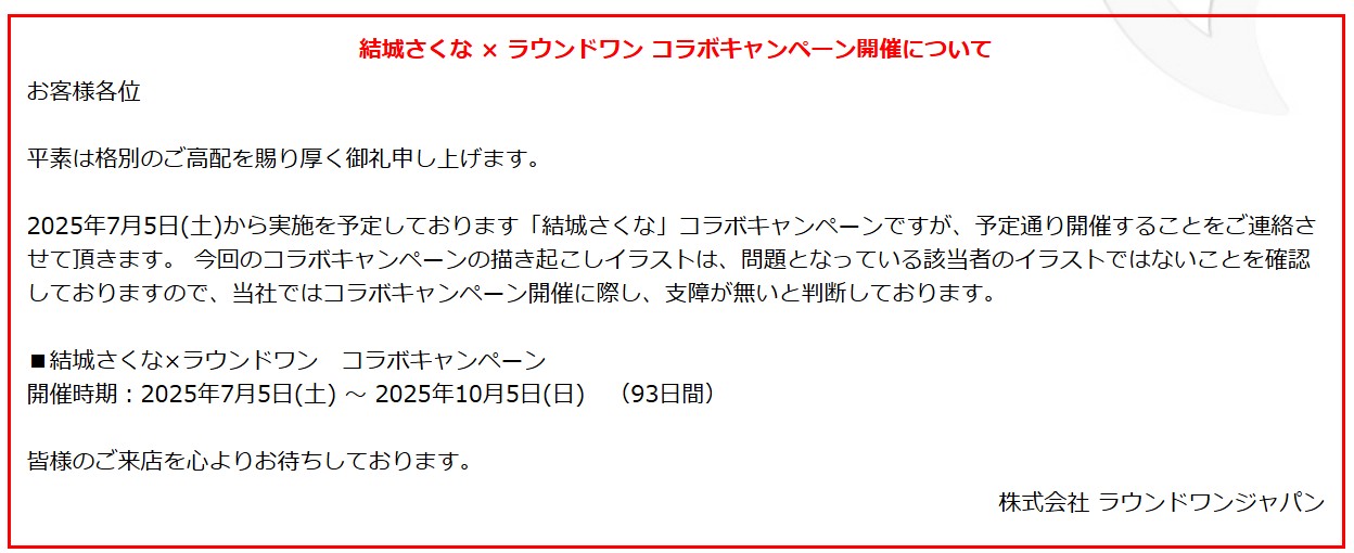 ラウンドワン、「結城さくな × ラウンドワン コラボキャンペーン」は予定通り実施する旨を発表(2/2)