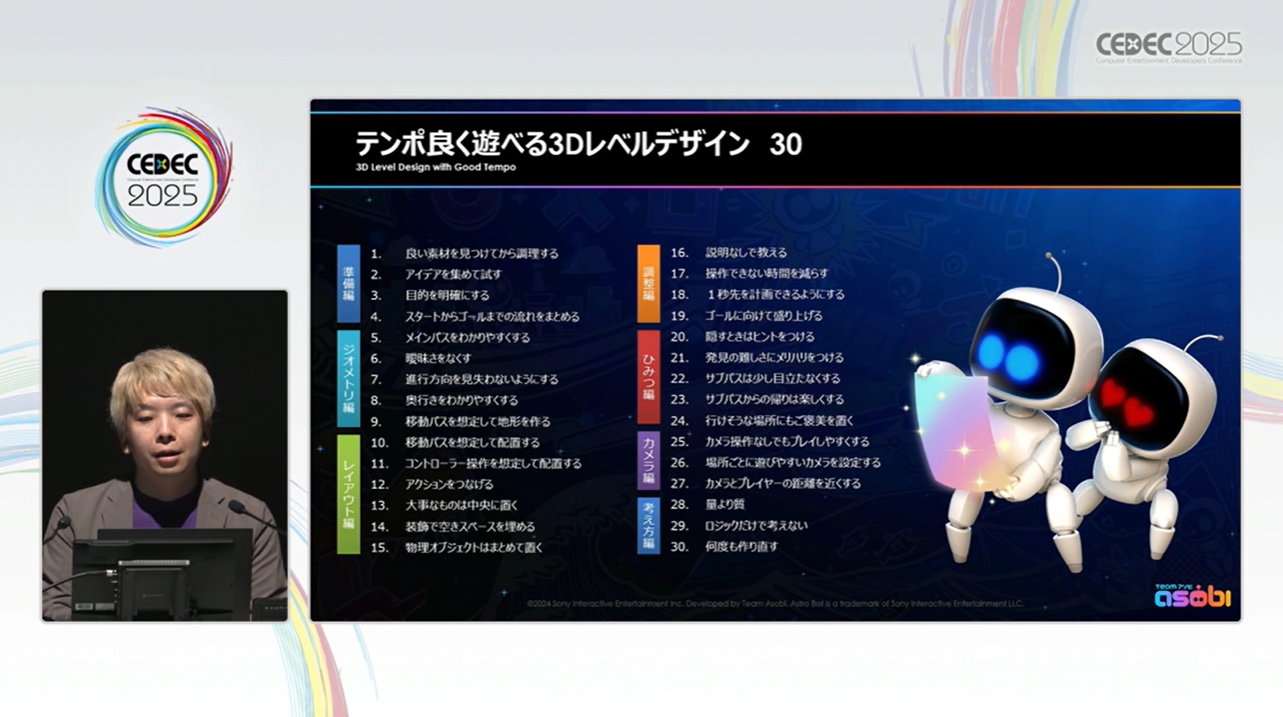 「アストロボット」プレイヤーを迷わせない! テンポよく遊べるレベルデザインのポイント30【CEDEC2025】(4/56)