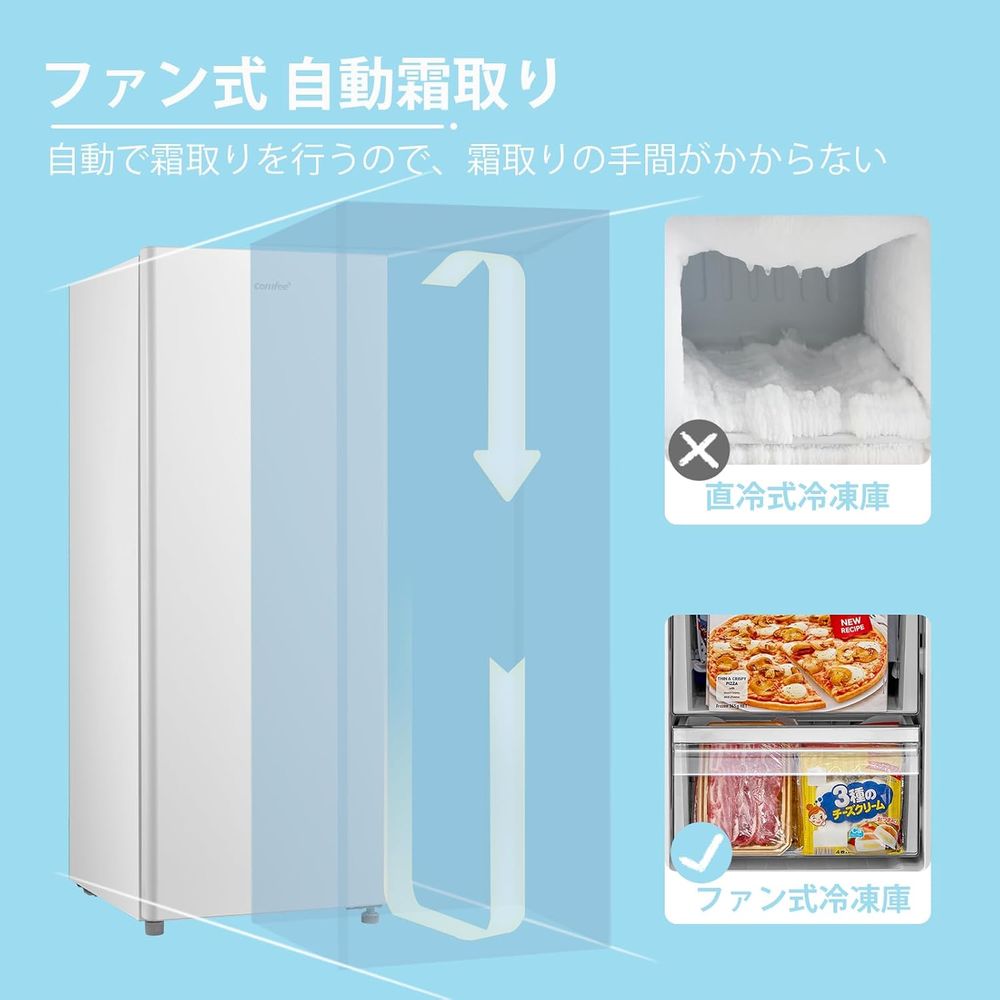 • COMFEE' ファン式冷凍庫 135L 前開き コンパクト 家庭用 霜取り不要 耐熱天板 省エネ率113% ノンフロン 温度調節 ホワイト RCU140WH1JP(E) 2024年モデル