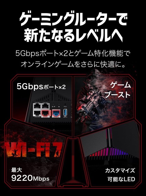 • TP-Link WiFi 7 ゲーミングルーター BE9300 トライバンド 5764(6GHz) + 2882 (5GHz) +574(2.4GHz) 無線LANルーター 5Gbps WANポート x1 5Gbps LANポート x1 2.5Gbps LANポート x3 ゲーミングLEDパネル HomeSheild メーカー保証3年 Archer GE550/A