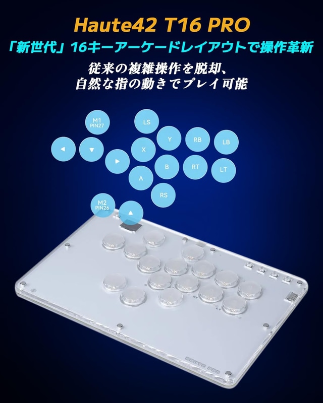 • Haute42 アケコン レバーレス レバーレスコントローラー T16 PROブラック ボタン静音強め 押し心地絶秒 スリムで天板広め EVO 大会 膝置き可 無遅延 格闘ゲーム向け For PC Switch2 Switch PS4 PS3等に対応 レバーレス コントローラー TYPE-C RGB LED ホットスワップ 向け アーケートコントローラー アーケードスティック 連射機能
