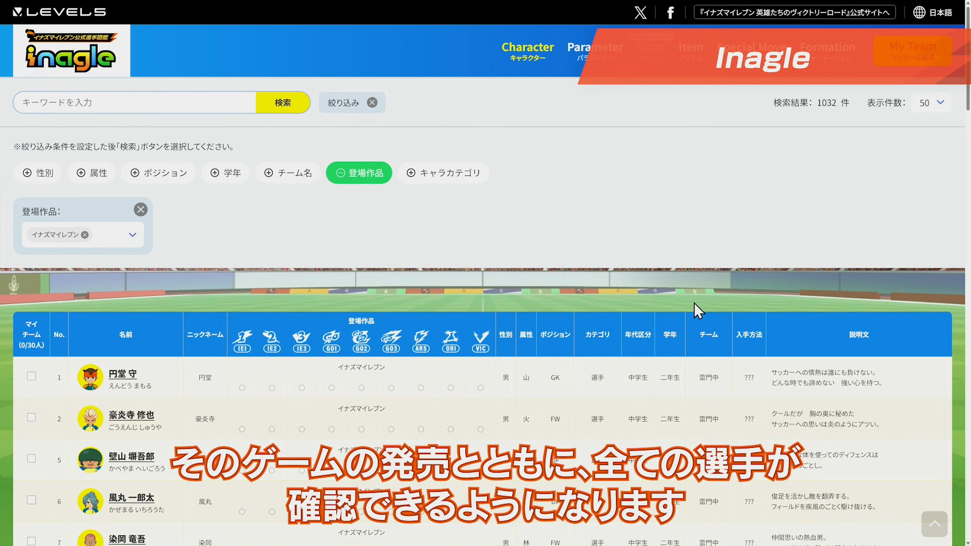 「イナズマイレブン」全選手のパラメーターを確認できる検索システム「イナグル」登場! 10月22日より公開(2/5)