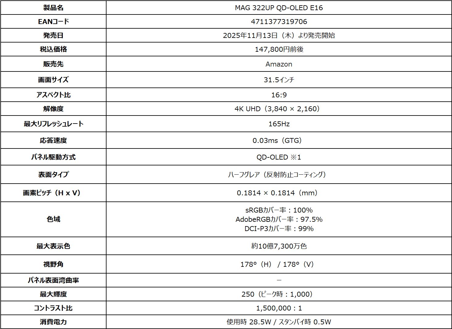 MSI、QD-OLEDパネル搭載31.5インチゲーミングモニター「MAG 322UP QD-OLED E16」を11月13日に発売(3/8)