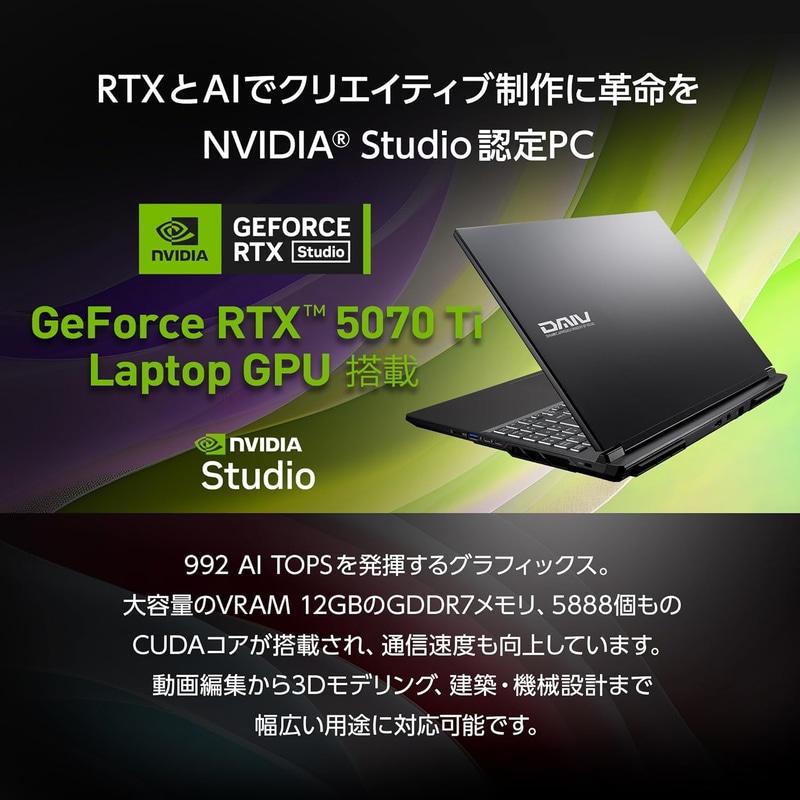 • mouse 【RTX 5070 Ti/NVIDIA Studio認定製品】クリエイターPC ノートPC DAIV N6 (Core Ultra 7 255HX 32GB メモリ 1TB SSD Windows 11 Pro 16インチ WQXGA 動画編集 CAD 3DCG 3年メーカー保証) N6I7G7TBK3SKW105AZ