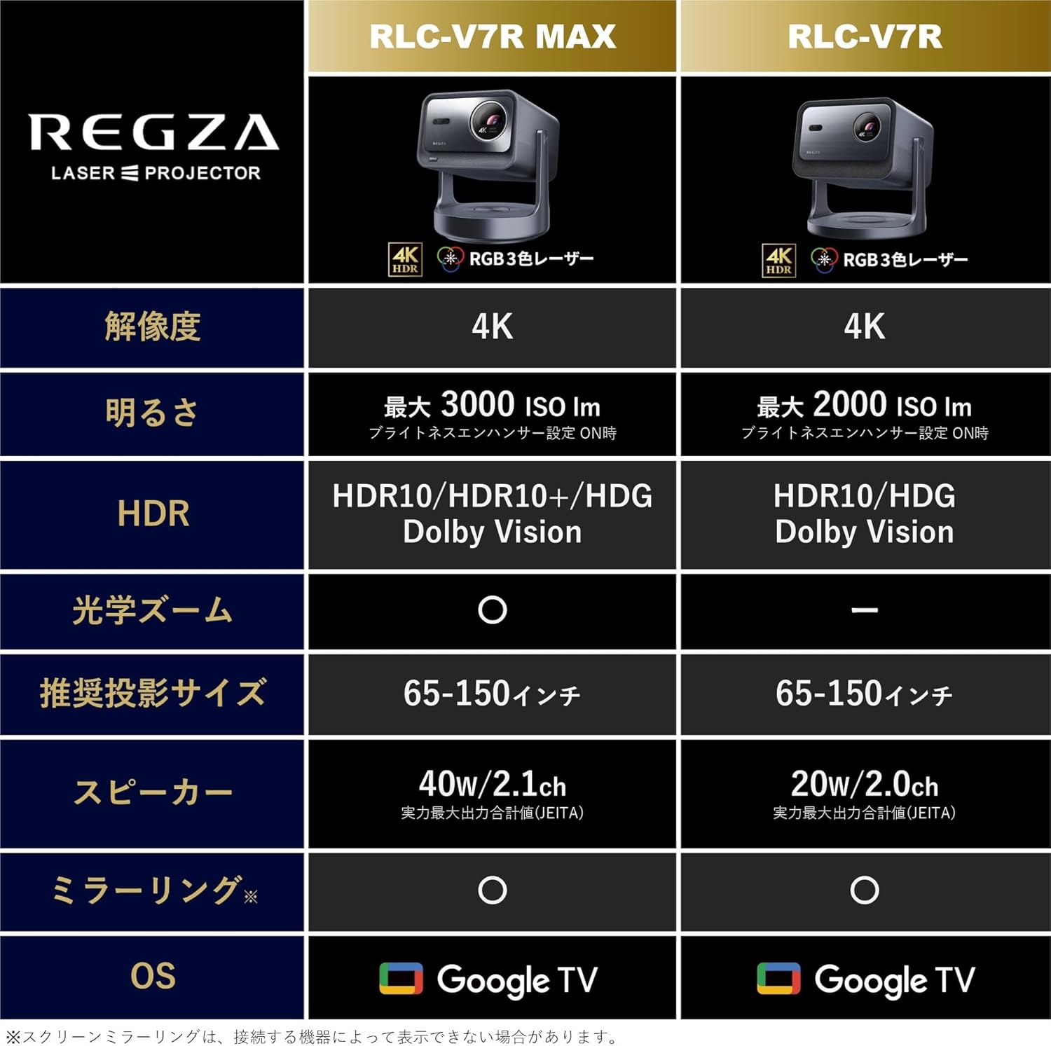 • 【VGP 2025 金賞&ホームシアター大賞】REGZA(レグザ) 4K プロジェクター RLC-V7R MAX (RGB 3色レーザー / 光学ズーム / 40W 2.1ch / Google TV搭載/スマホ連携 / 3,000 ISOルーメン/自動台形補正/自動フォーカス調整/自動障害物回避/壁面色自動補正/目の自動保護機能/スタンド一体型/光るリモコン)