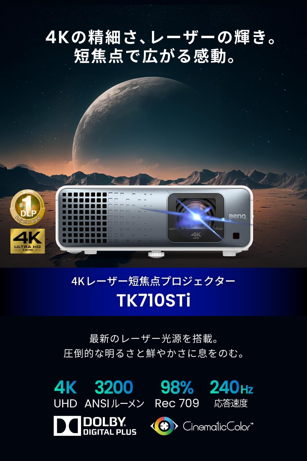 • ベンキュージャパン BenQ TK710STi 4K レーザー短焦点プロジェクター 4K/レーザー/3200ANSIルーメン/HDR10/低入力遅延/フルHD 240Hz対応/RPG,FPS,シネマモード/ゲーミング/Netflix対応Android TV搭載/Rec.709 95%/120インチ大画面/縦横回転台形補正//5Wスピーカー