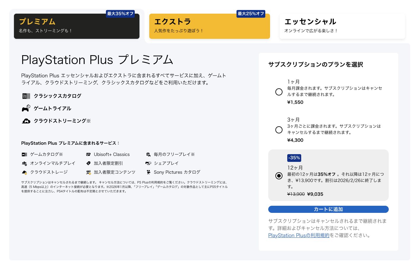 ※1ヶ月、3ヶ月、12ヶ月利用権ですでにご加入中の方はPlayStation Plus プレミアムプランへのアップグレードが35%OFFの価格でご利用いただけます。現在ご加入中のプランの残期間に適用されます。