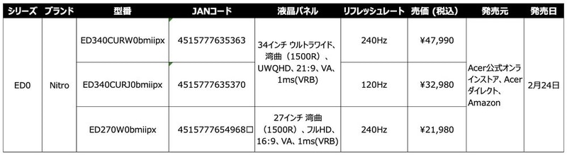 Acer、1500Rの湾曲ゲーミングモニター「Nitro ED0」3機種を発売!(4/16)