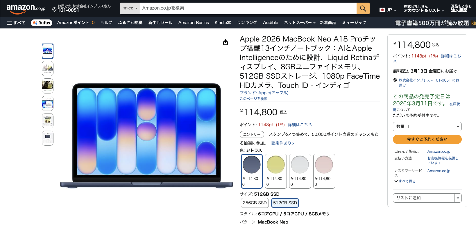 (C) 2026 Apple Inc. All rights reserved. Amazonで購入Apple 13インチノートブック MacBook Neo A18 Proチップ/8GBユニファイドメモリ/256GB SSDストレージ/インディゴApple 13インチノートブック MacBook Neo A18 Proチップ/8GBユニファイドメモリ/256GB SSDストレージ/シルバーApple 13インチノートブック MacBook Neo A18 Proチップ/8GBユニファイドメモリ/256GB SSDストレージ/シトラスApple 13インチノートブック MacBook Neo A18 Proチップ/8GBユニファイドメモリ/256GB SSDストレージ/ブラッシュApple 13インチノートブック MacBook Neo A18 Proチップ/8GBユニファイドメモリ/512GB SSDストレージ/Touch ID/インディゴApple 13インチノートブック MacBook Neo A18 Proチップ/8GBユニファイドメモリ/512GB SSDストレージ/Touch ID/シルバーApple 13インチノートブック MacBook Neo A18 Proチップ/8GBユニファイドメモリ/512GB SSDストレージ/Touch ID/シトラスApple 13インチノートブック MacBook Neo A18 Proチップ/8GBユニファイドメモリ/512GB SSDストレージ/Touch ID/ブラッシュ